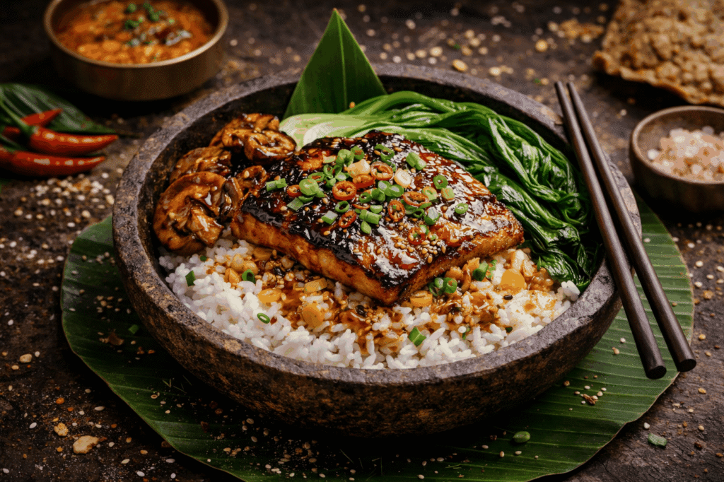 Poisson de Ferhan, délicatement grillé et servi sur un lit de riz doré aux herbes sauvages, offrant une explosion de saveurs marines.