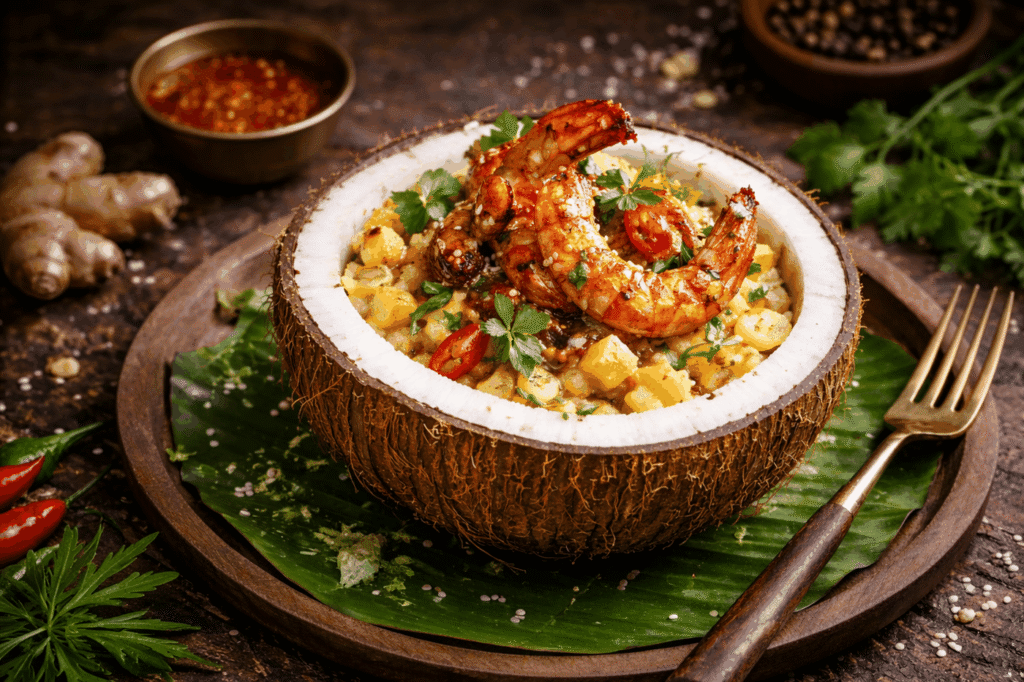 Un mélange unique de nouilles sautées accompagnées de crevettes nacrées issues les eaux tropicales de Ferhan.